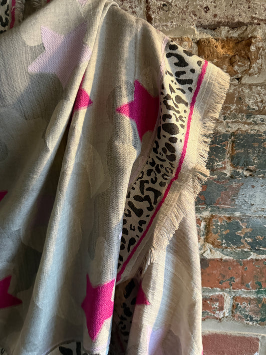 Multi Pattern Long Scarf with Animal Trim -Ivory, Grey, Pink, Lavender