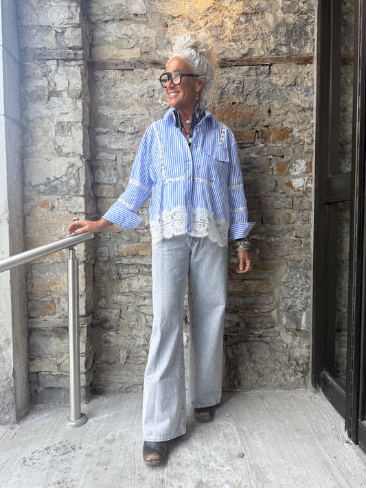 Wide Pinstripe Shirt with Lace Detail- Chambray Blue and White