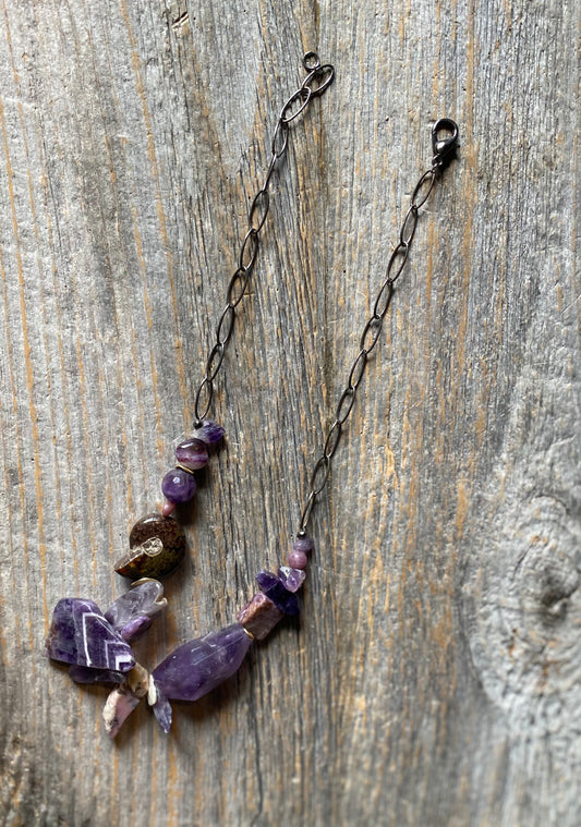 22" Amethyst, Pink Tourmaline, Charoite, Pearl & Pink Opal Necklace on Vintage Gunmetal Chain