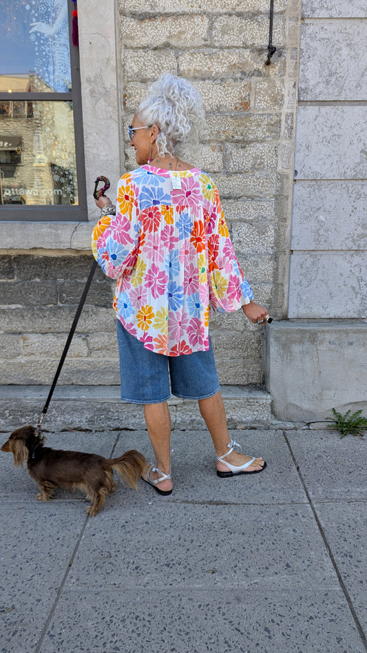 Multicolour Floral Balloon Sleeve Peasant Top