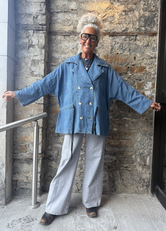 Light Wash Denim Car Coat Jacket with Draw String Waist