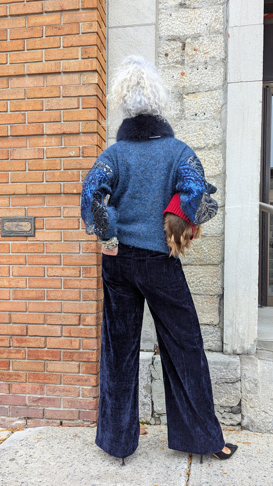 2PC Beige Velvet and Rose Gold Sequin Blazer and Wide Leg Pant Set
