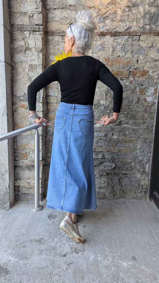 Cotton Denim Maxi Skirt with Gold Painted Buttons