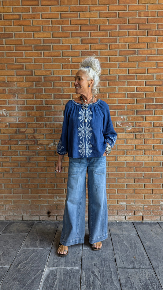 100% Waffle Cotton Relaxed Fit Embroidered Top - NAVY