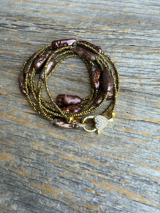 24" Long Brown Pearl and Bronze Versatile Necklace with Gold Clasp