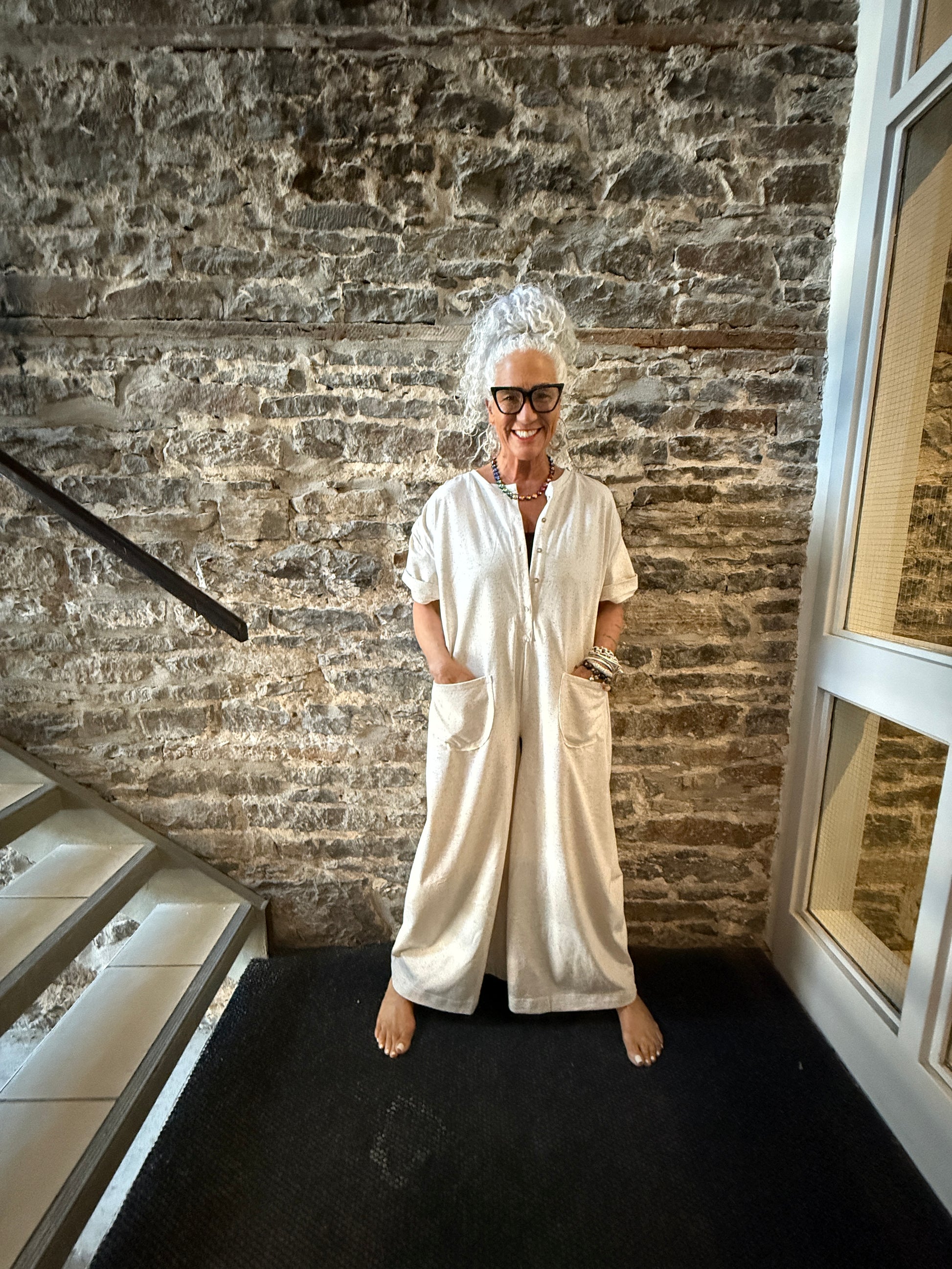 100% Cotton Speckled Oatmeal Relaxed Fit Wide Leg Jumpsuit - Oatmeal