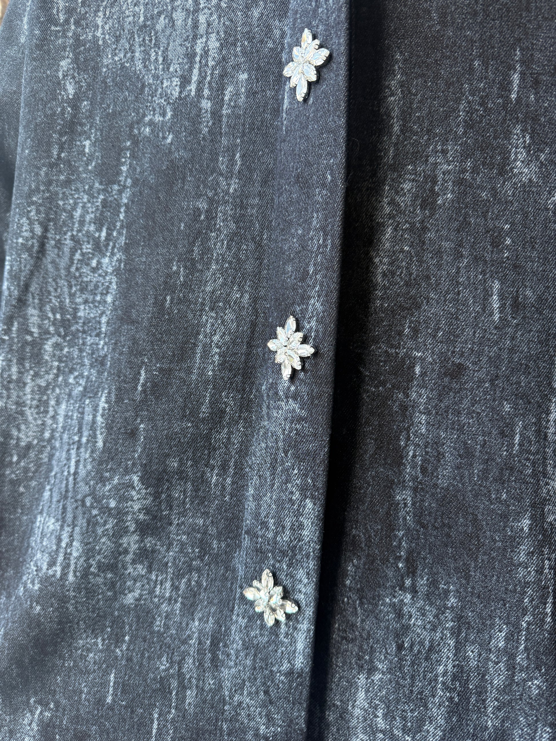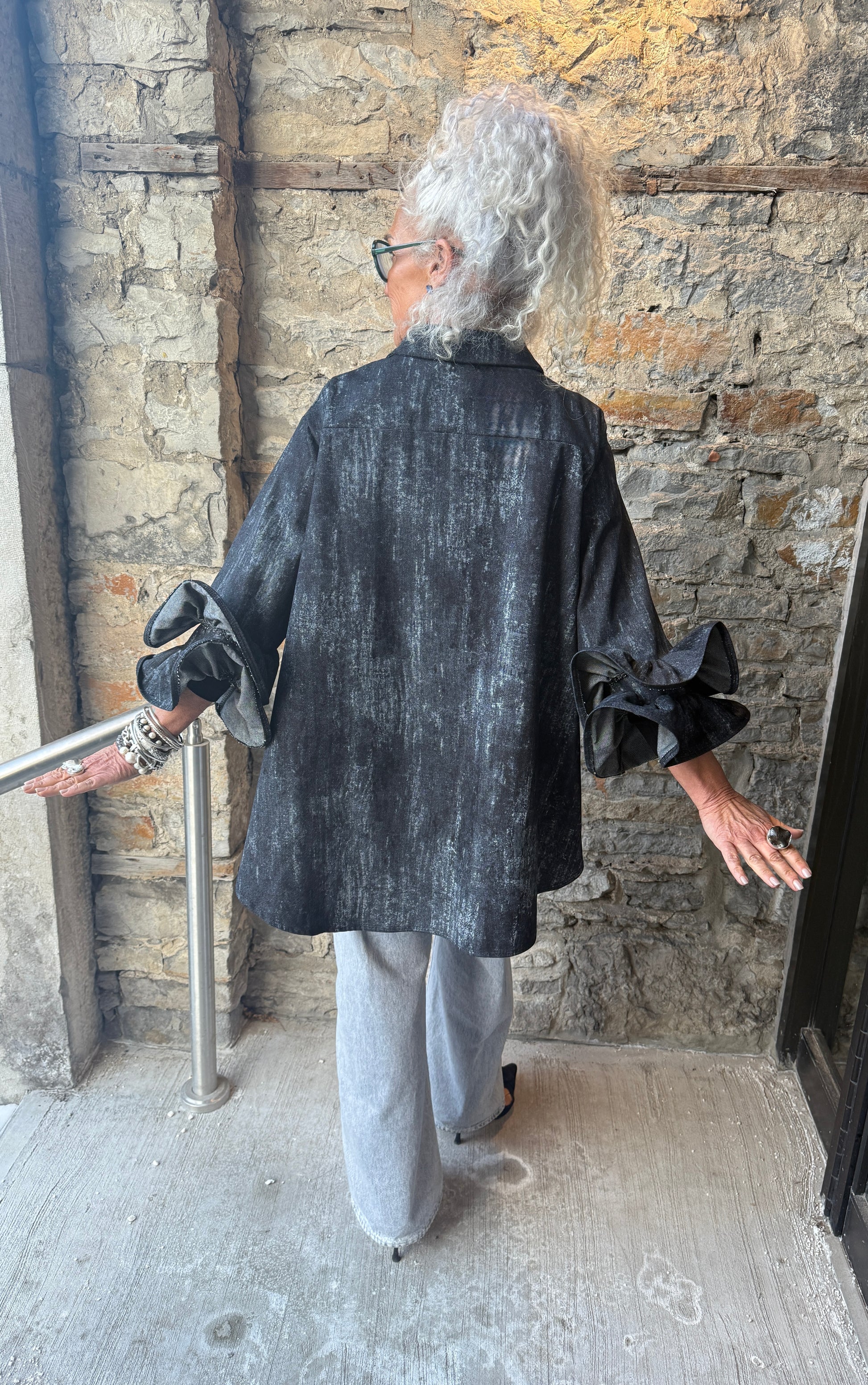 100% Cotton Ruffled Sleeve Acid Wash Denim Shirt -Black
