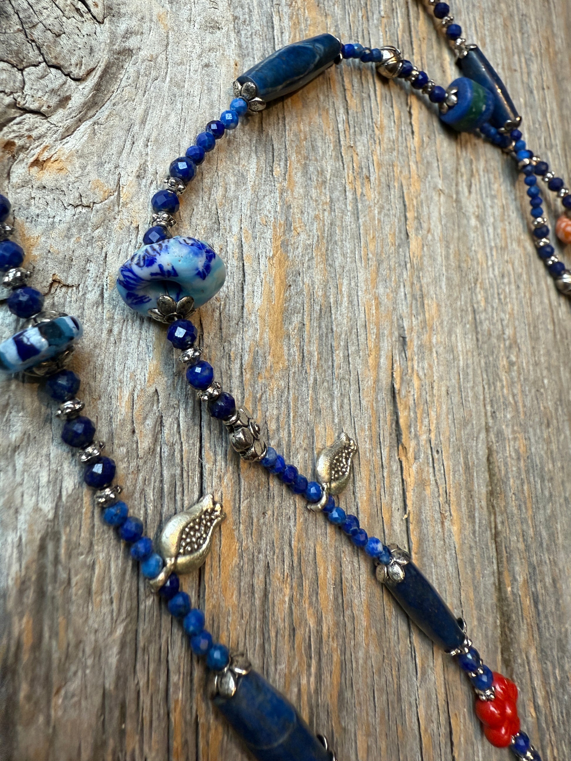 Blue Long Lariat necklace - Lapis Azul, Cinibar, Trading beads and sterling silver