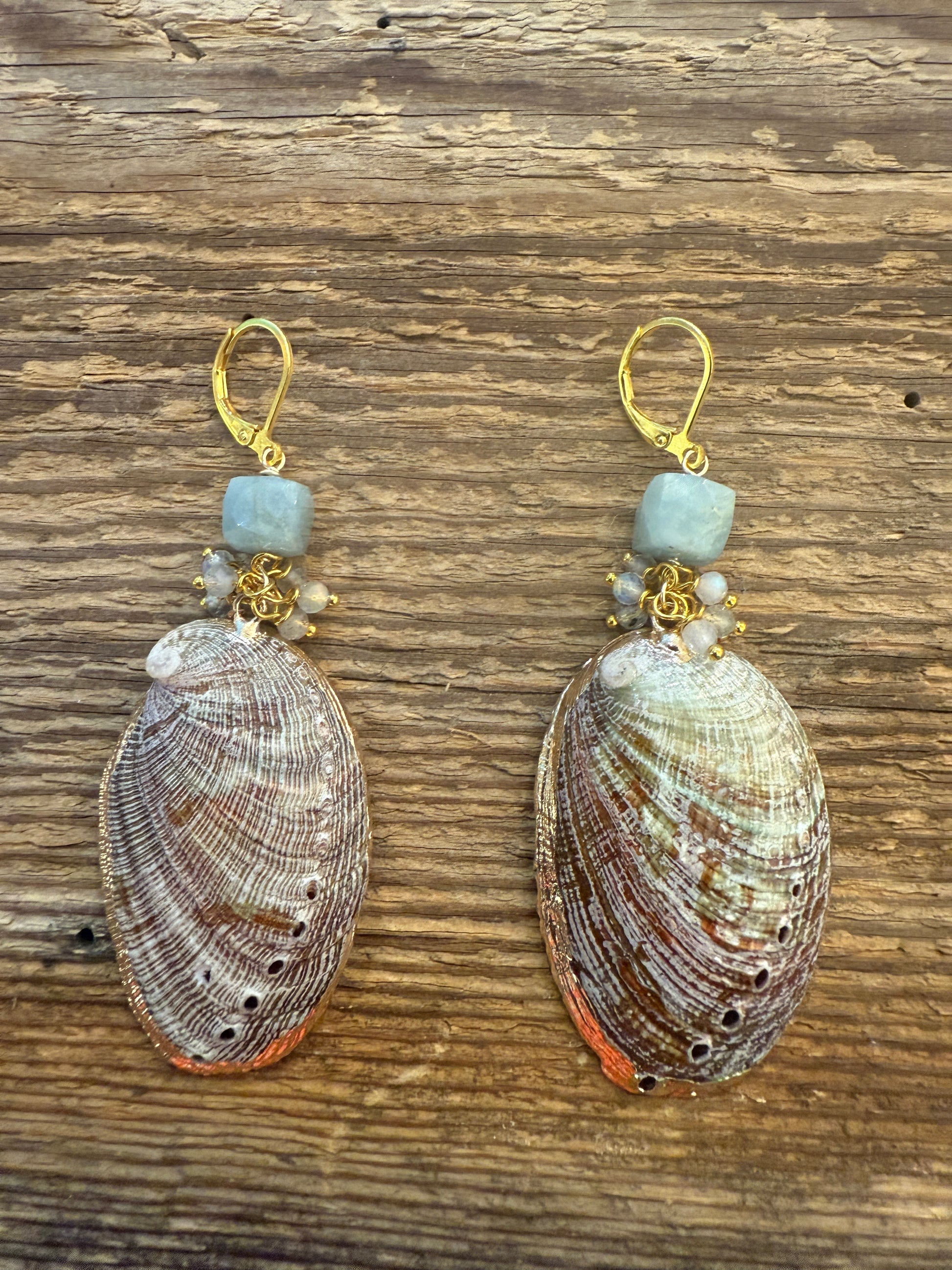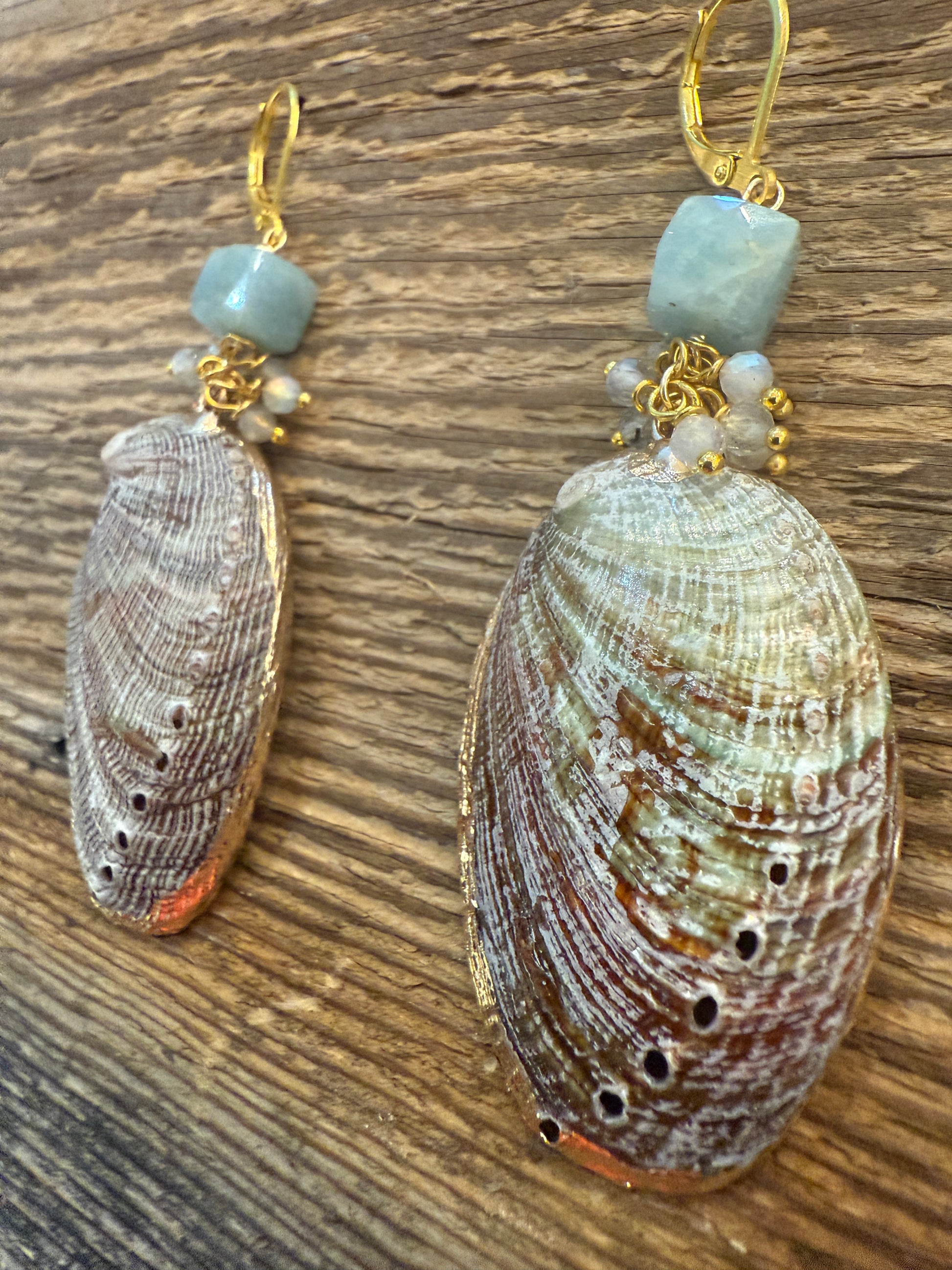 Gold SeaShell Drop Earrings - semi precious Aquamarine