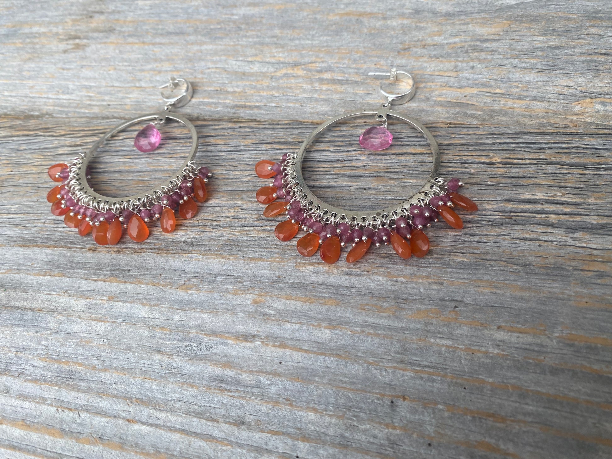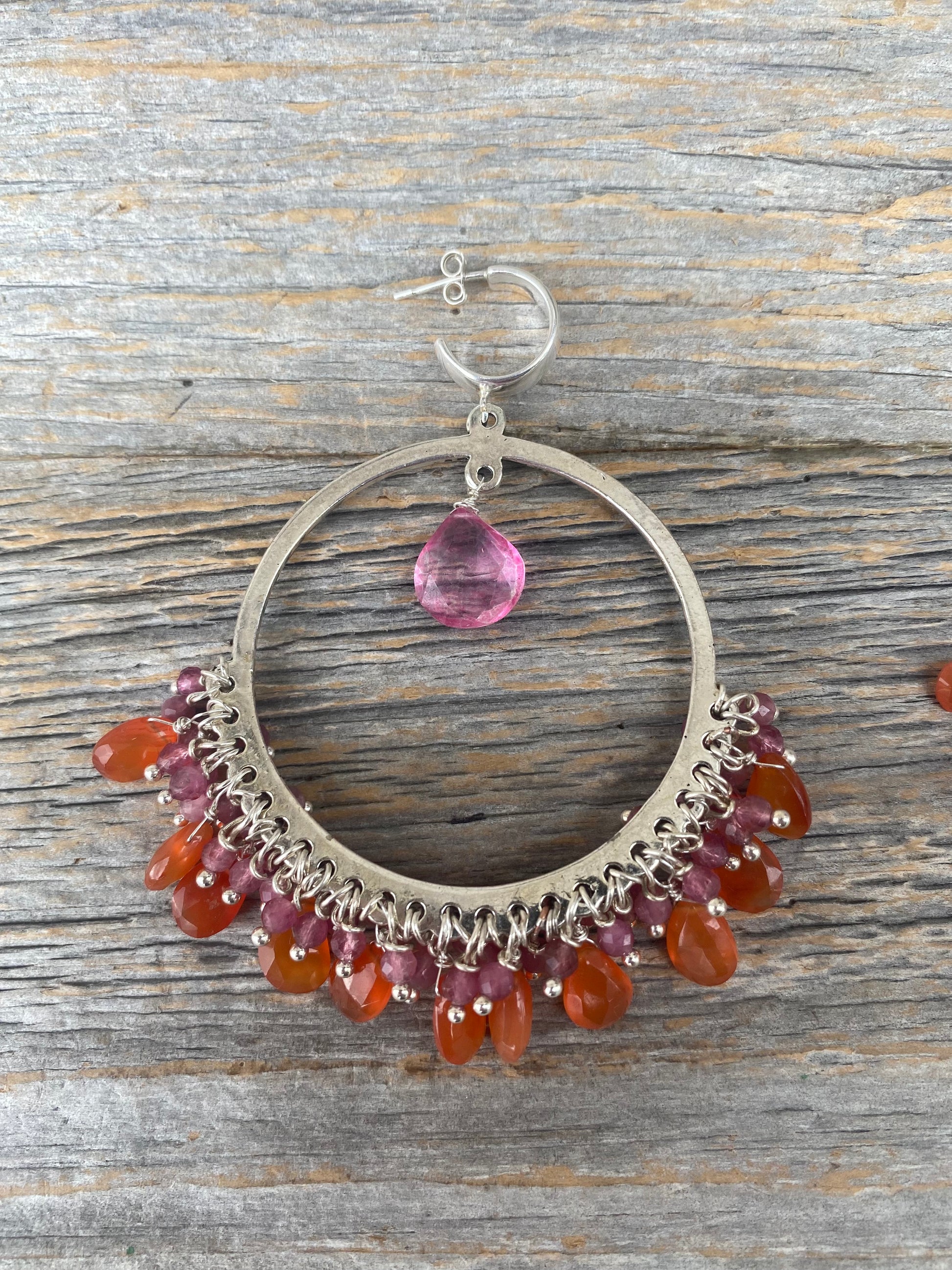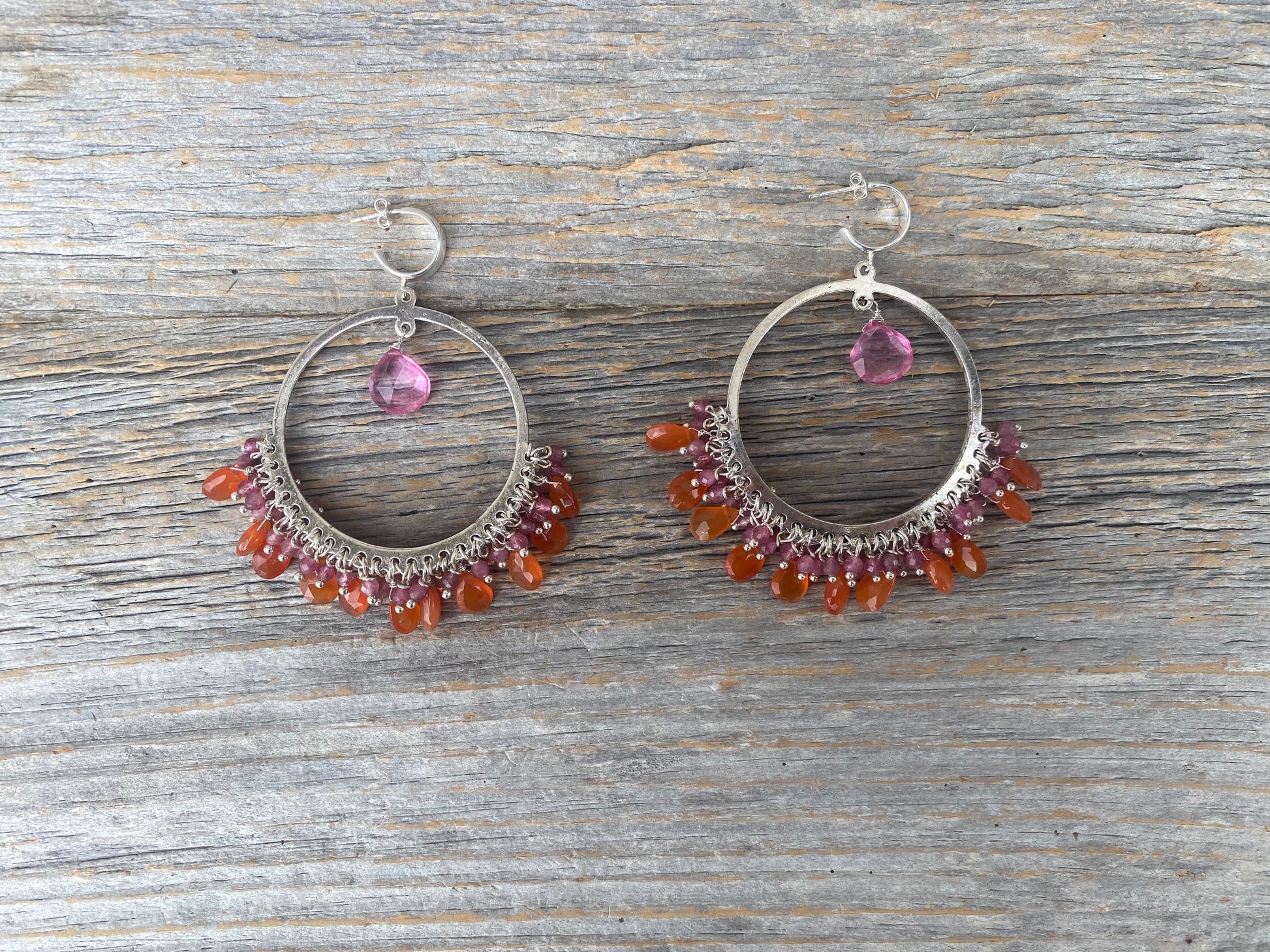Handmade in Canada Chandelier Hoop Earrings with Semi Precious Stones -Tourmaline and Carnelian