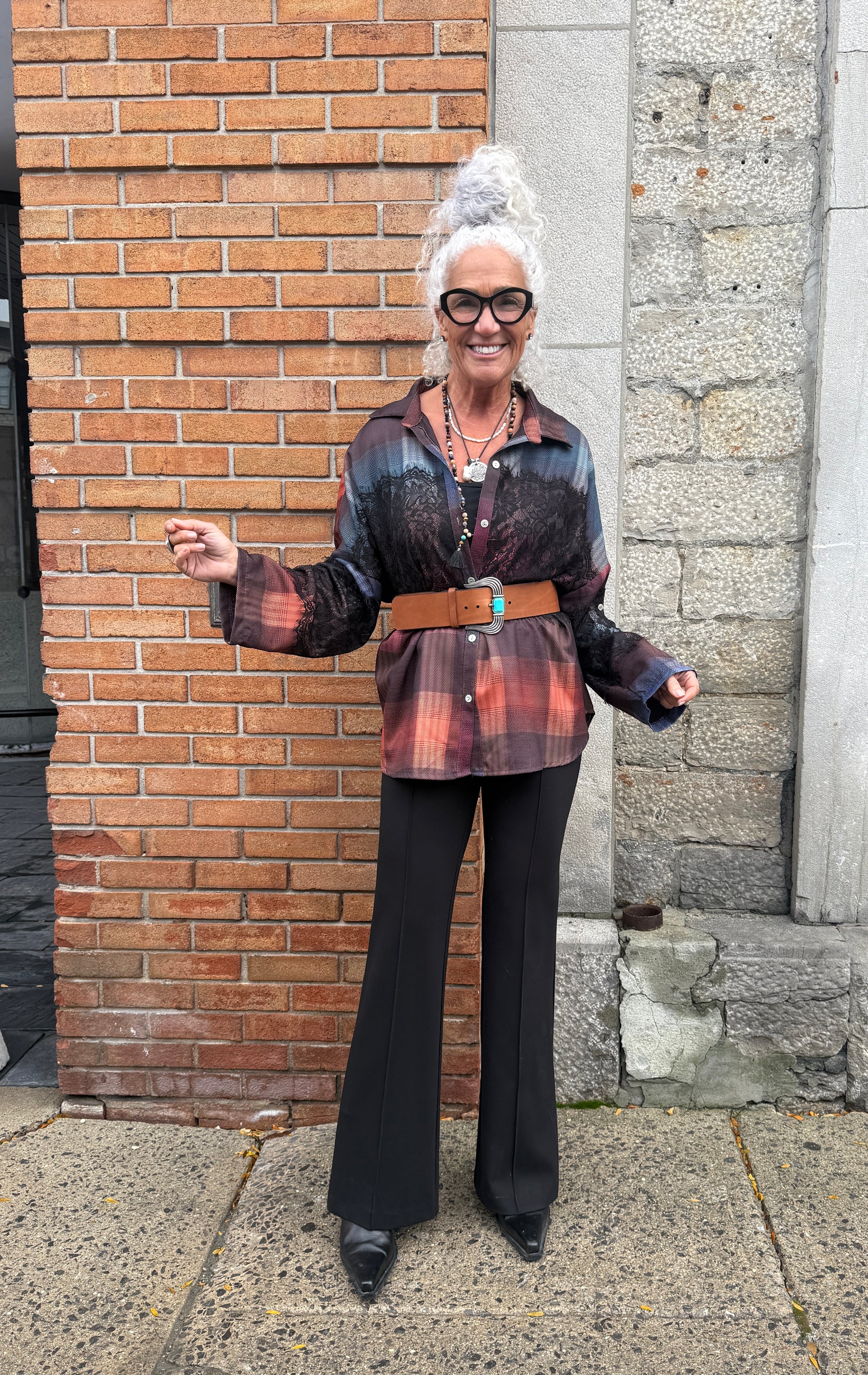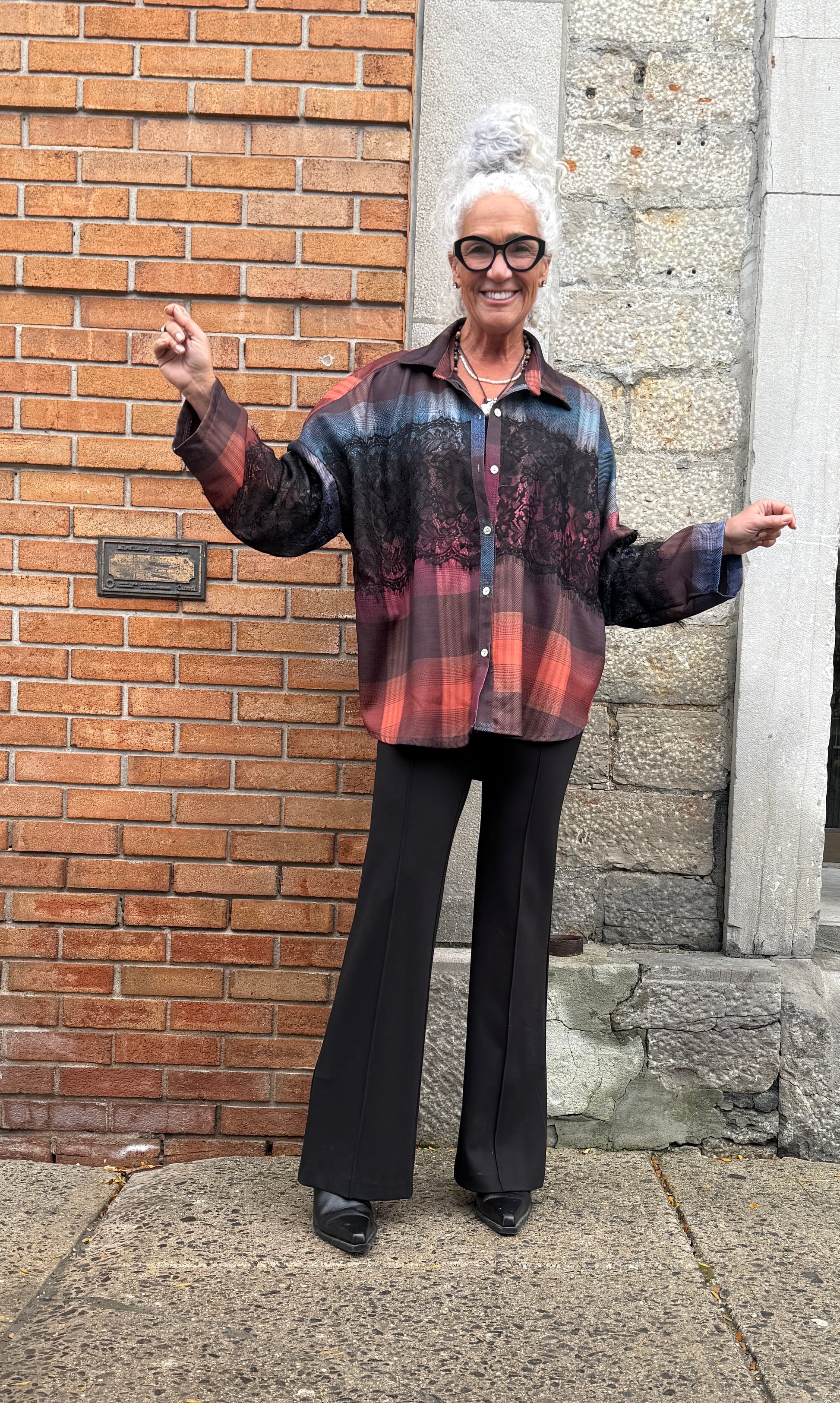 Linen Blend Patchwork Plaid Shirt with Lace Detail