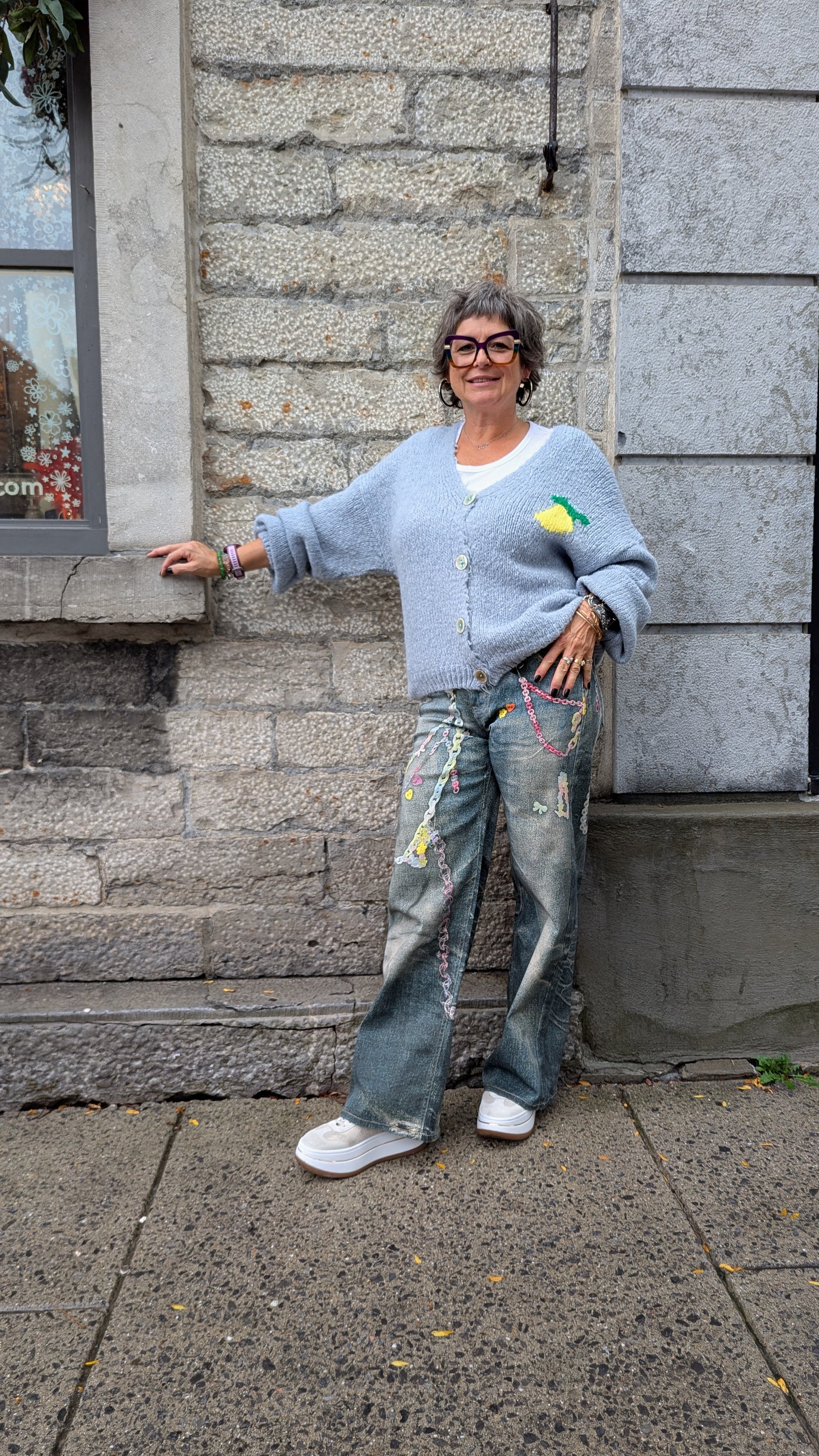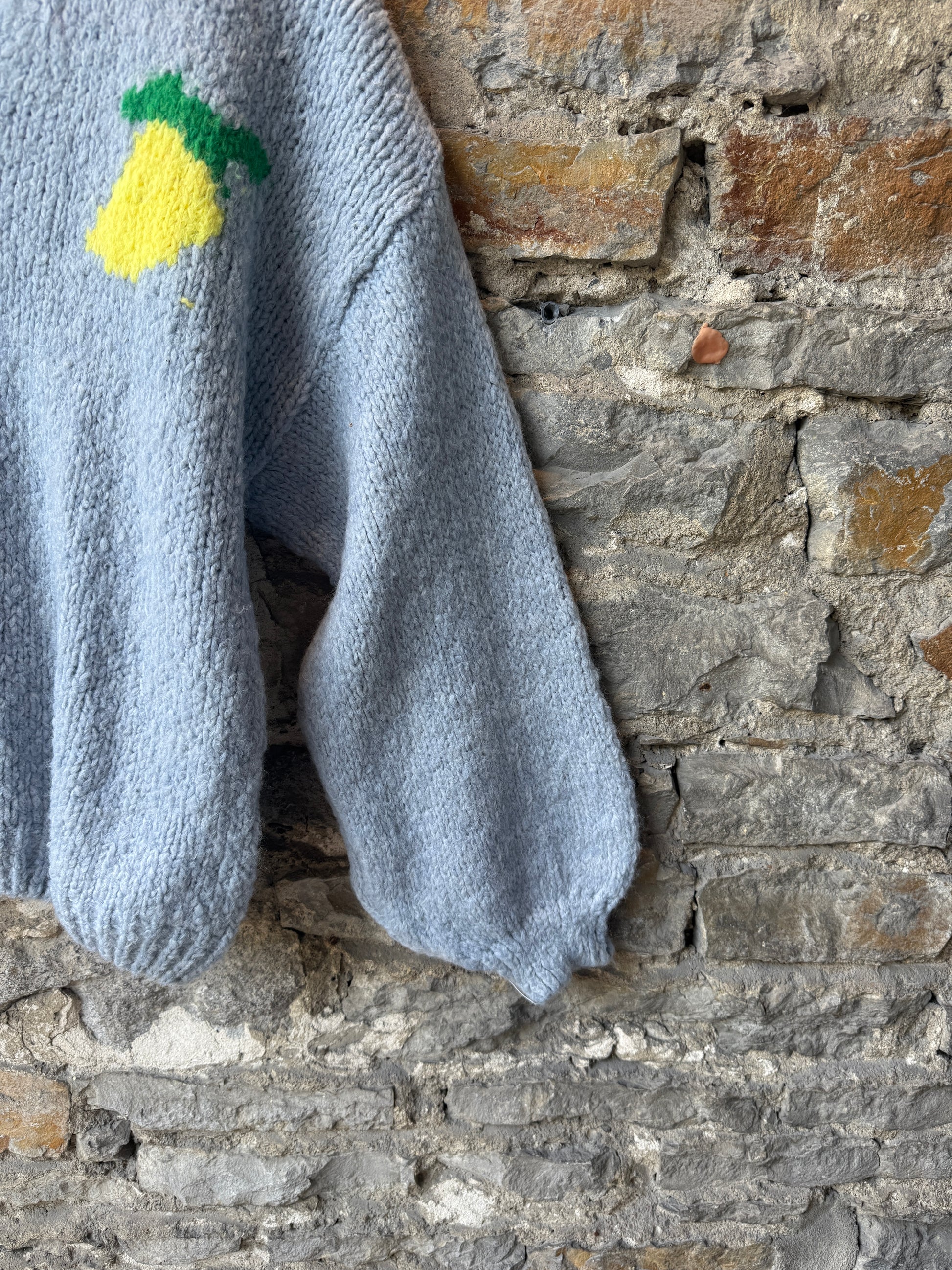 Oversized Knit Cardigan with Lemon Cello Motif- Blue Soft Grey Melange