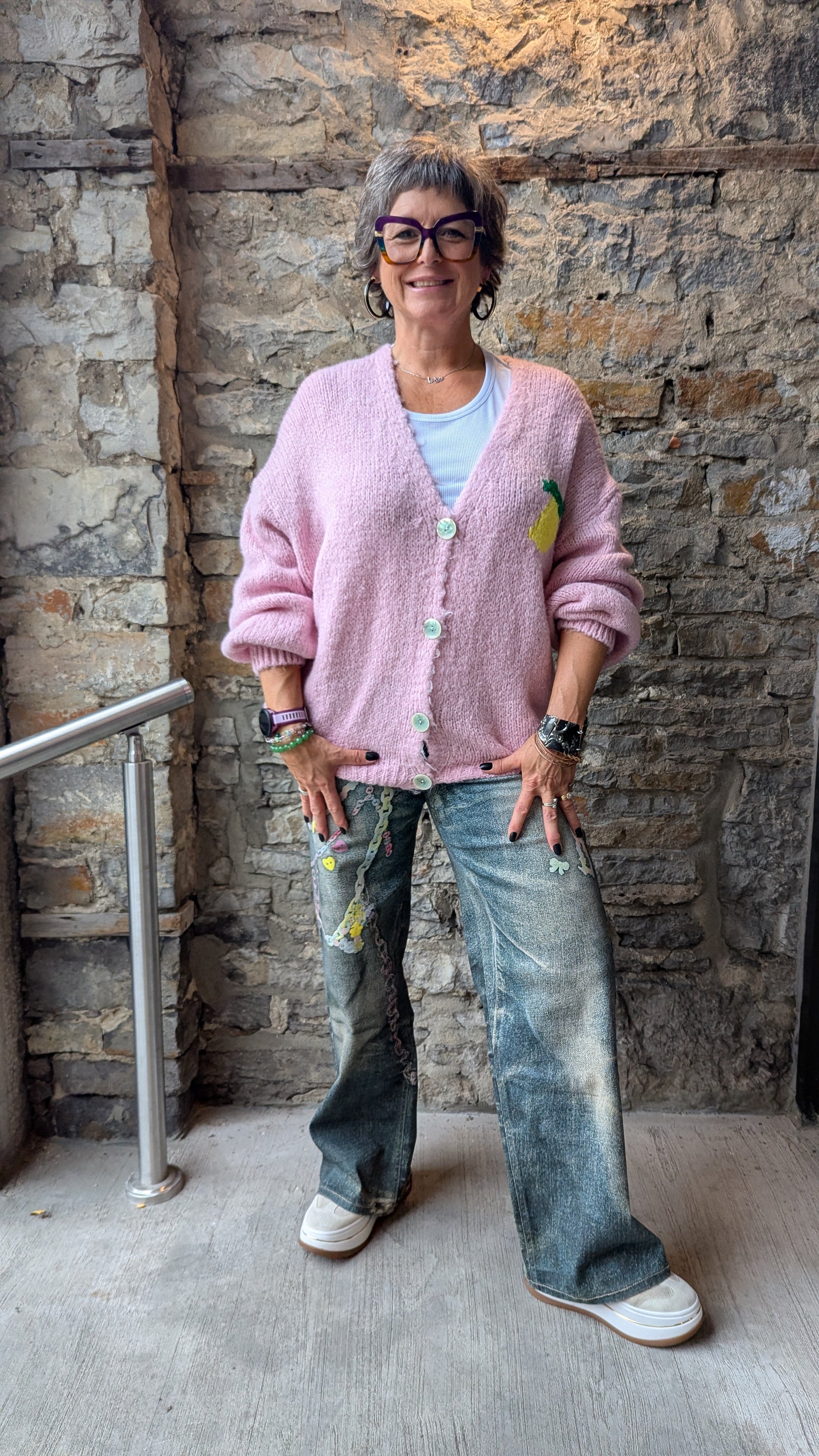 Oversized Knit Cardigan with Lemon Cello Motif- PINK