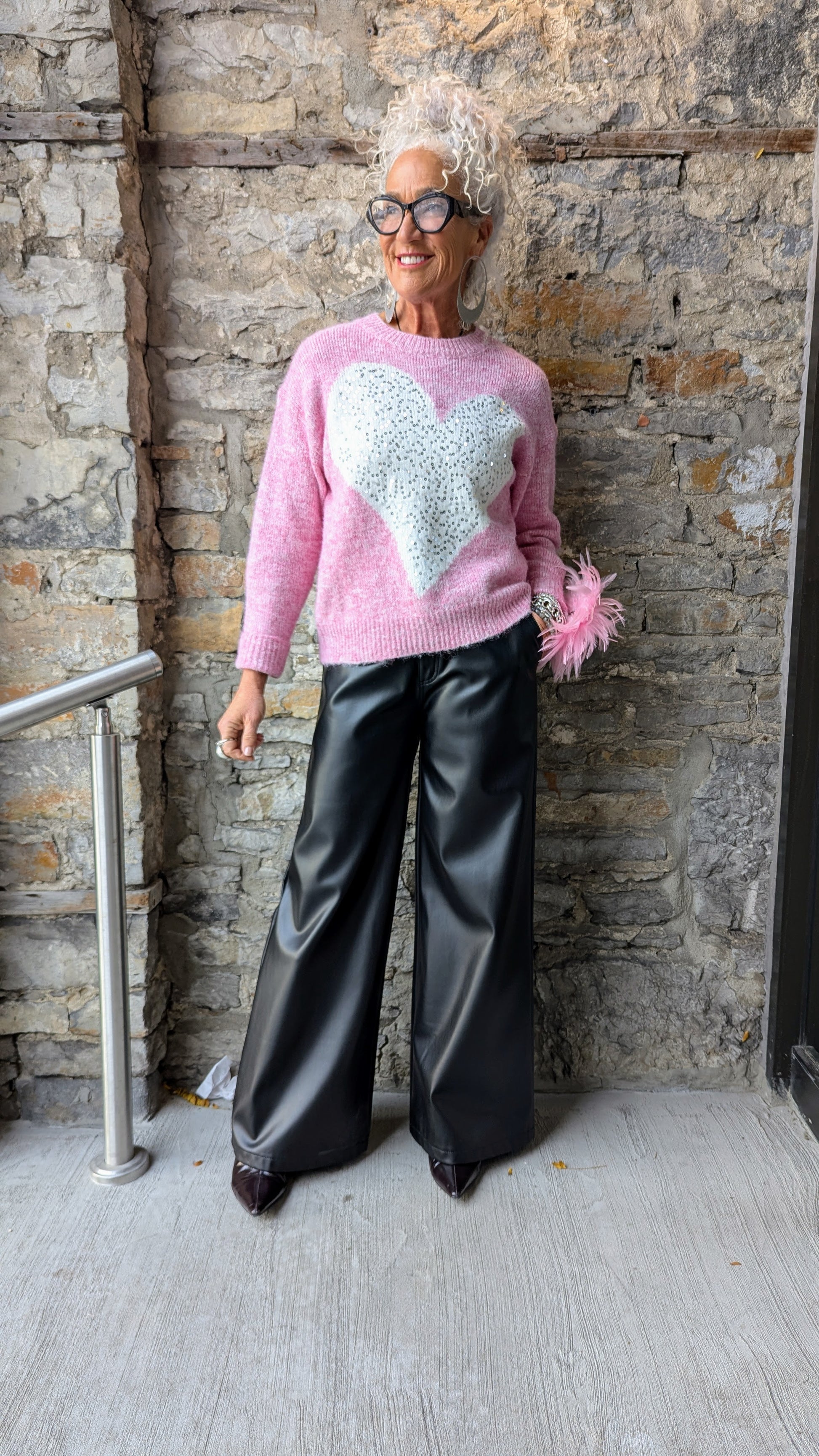 Pink Sequin Heart Crew Neck Knit Sweater