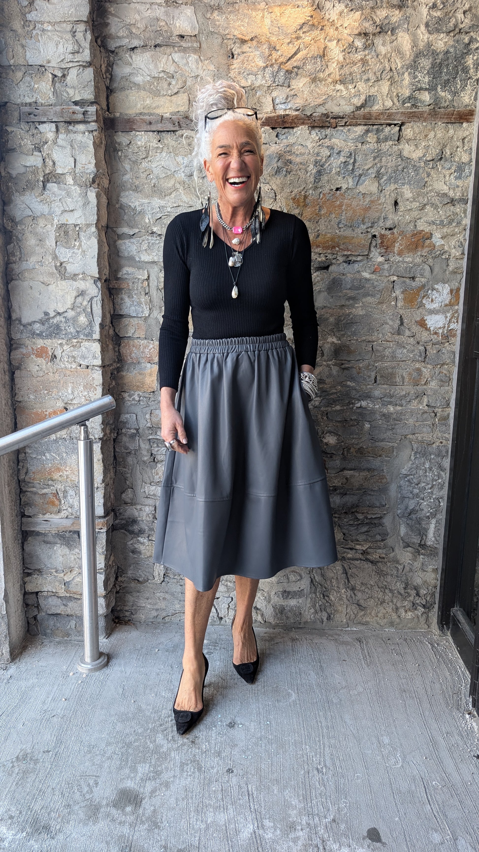 Pleather Midi Skirt with Pockets- GREY