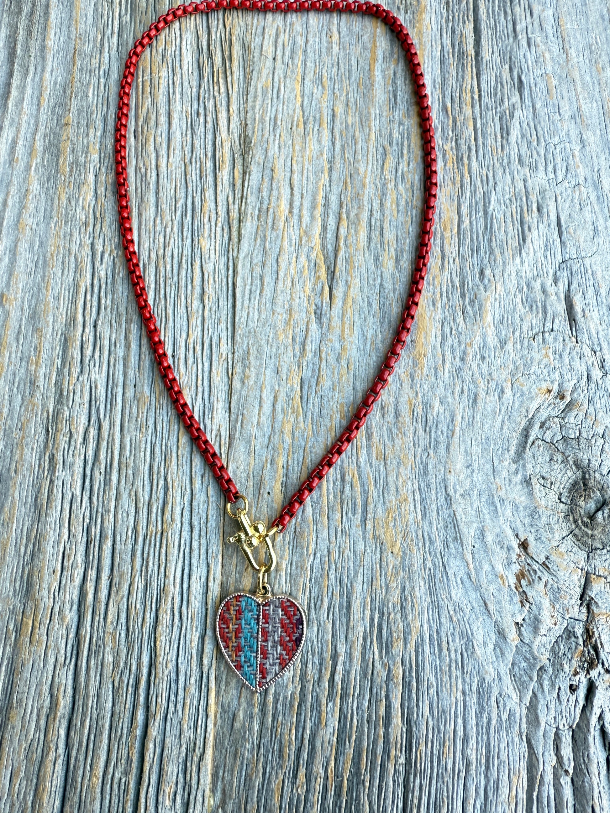 18" Red Enamel Link Necklace with Tapestry multi coloured gold trim heart pendant